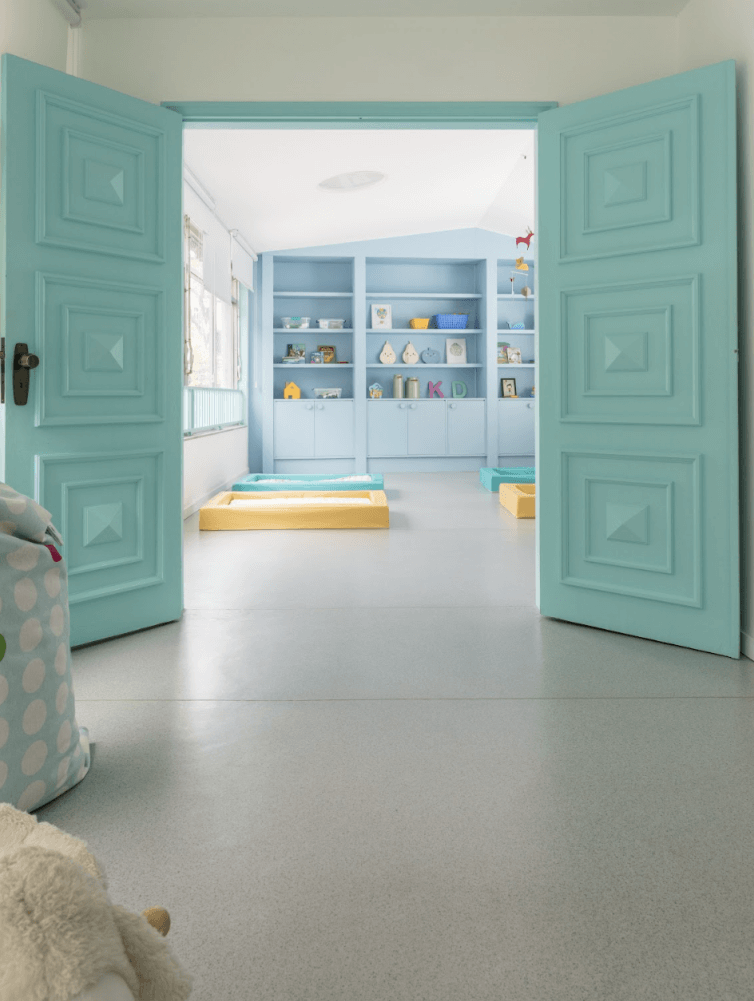 The nursery is carefully zoned by age to reflect different developmental needs. The ground floor, designed for toddlers and pre-school children, features a more vibrant palette and playful details. The first floor, dedicated to babies, offers softer tones, gentle materials, and a calmer atmosphere.